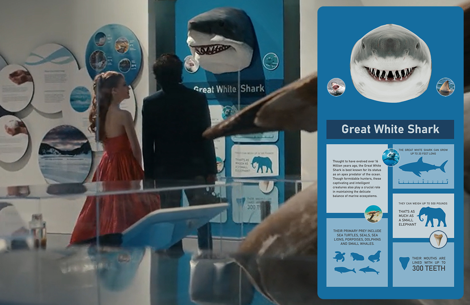 During a visit to the Canadian Museum of Nature, the protagonists bond over a Great White Shark exhibit. Unfortunately, this exhibit does not exist. Using a large shark head provided by my art director, I was tasked with designing one. It needed to be interesting to look at, and blend in seamlessly with its surroundings.