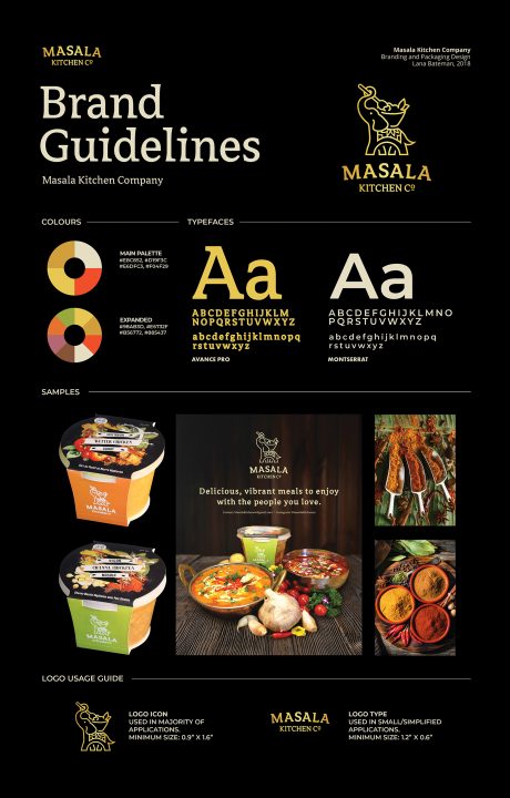 For the Masala Kitchen Company branding project, we wanted to create a logo design and brand which evoked classic indian motifs, colourful and vibrant spices, and rich, beautiful foods enjoyed with the people you love. This elephant and bowl logo is what we came up with, which is warm and friendly, and brings in those classic motifs while also establishing a modern, versatile brand identity. My client was very pleased with the result! Additionally, we applied the new branding to sell sheets, farmer’s market banners, social media pages and packaging designs for a line of products that sold at FarmBoy, Natural Food Pantry, BurrowShop and Farmer’s Markets!